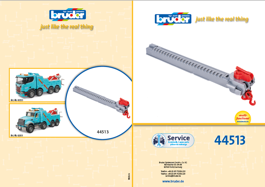 Products purchased on the Bruder Parts website can be returned to Bruder Toys for a full refund within 10 days of the received date. In order to be eligible for return, products must be in an unused condition with their original packaging intact.